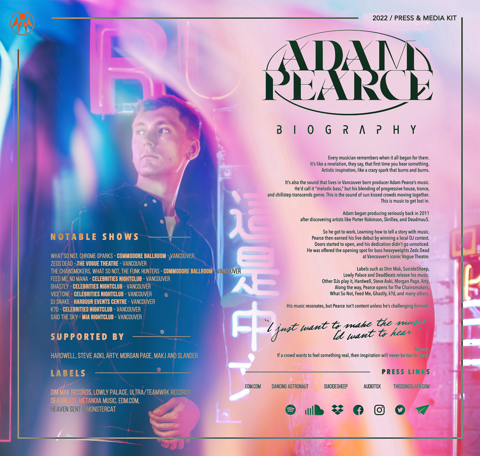 Every musician remembers when it all began for them. It’s like a revelation, they say, that first time you hear something. Artistic inspiration, like a crazy spark that burns and burns. It’s also the sound that lives in Vancouver born producer Adam Pearce’s music. He’d call it “melodic bass,” but his blending of progressive house, trance, and chillstep transcends genre. This is the sound of sun kissed crowds moving together. This is music to get lost in. Adam began producing seriously back in 2011 after discovering artists like Porter Robinson, Skrillex, and Deadmau5. So he got to work, Learning how to tell a story with music.